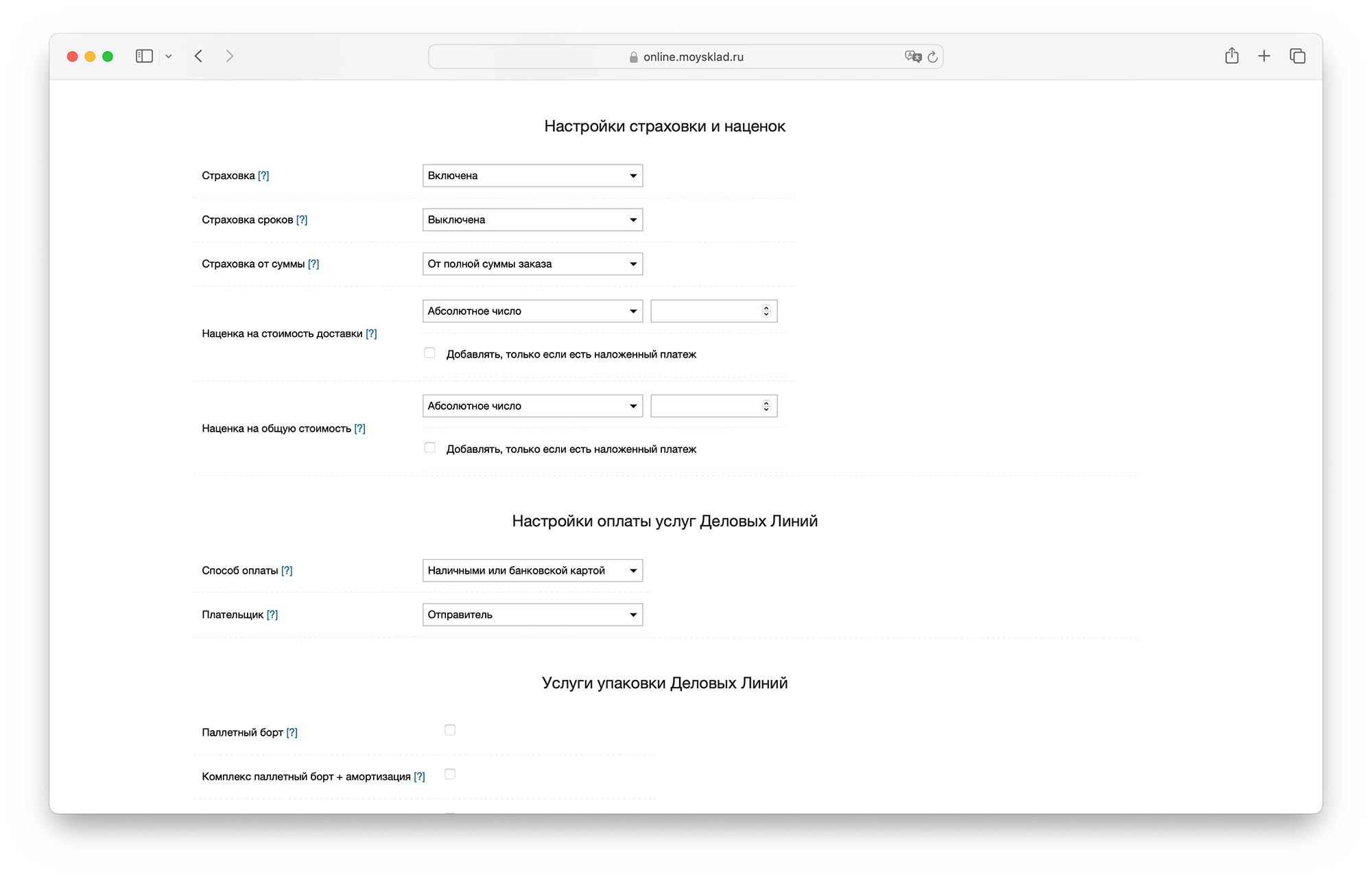 • выбор услуг транспортировки и упаковки от Деловых Линий