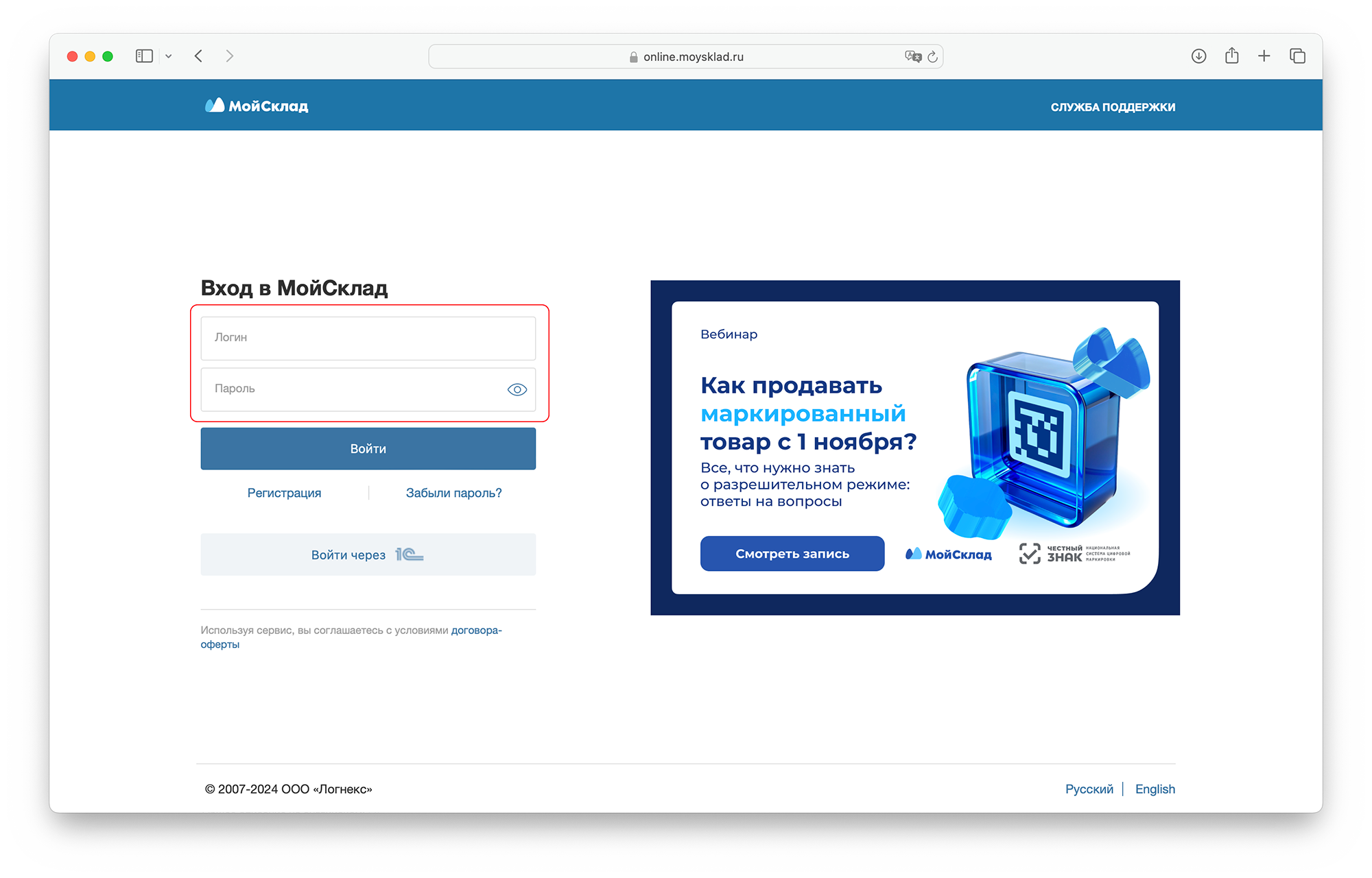 Перейдите на страницу https://online.moysklad.ru и выполните вход, указав данные вашей учетной записи.