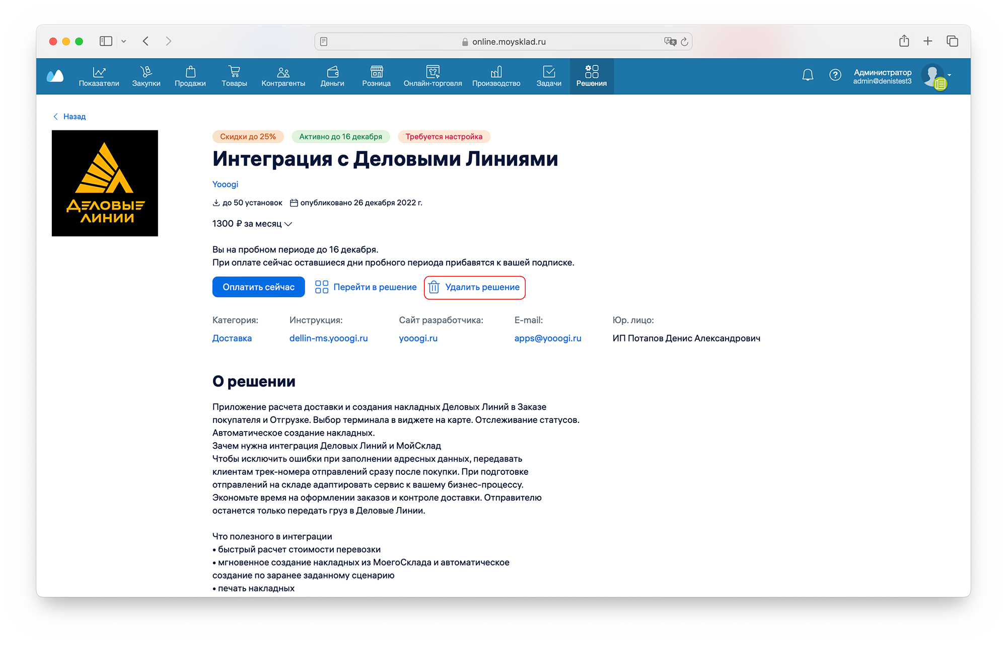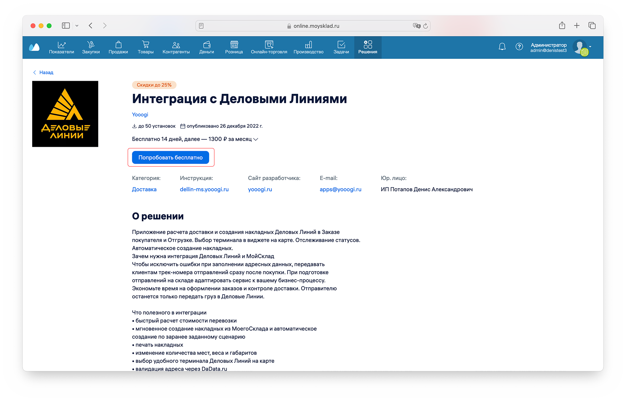 В открывшемся каталоге перейдите в карточку "Интеграция с Деловыми Линиями" (Yooogi)