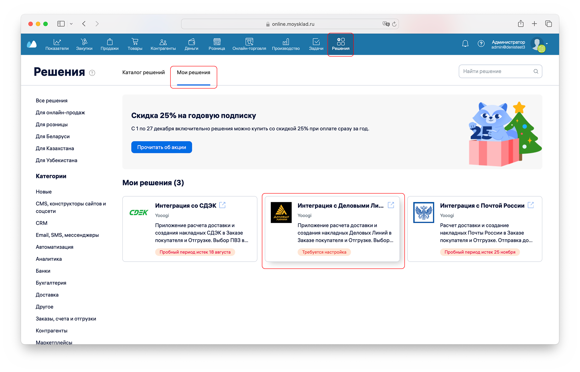 В открывшемся каталоге перейдите в карточку "Интеграция с Деловыми Линиями" (Yooogi)