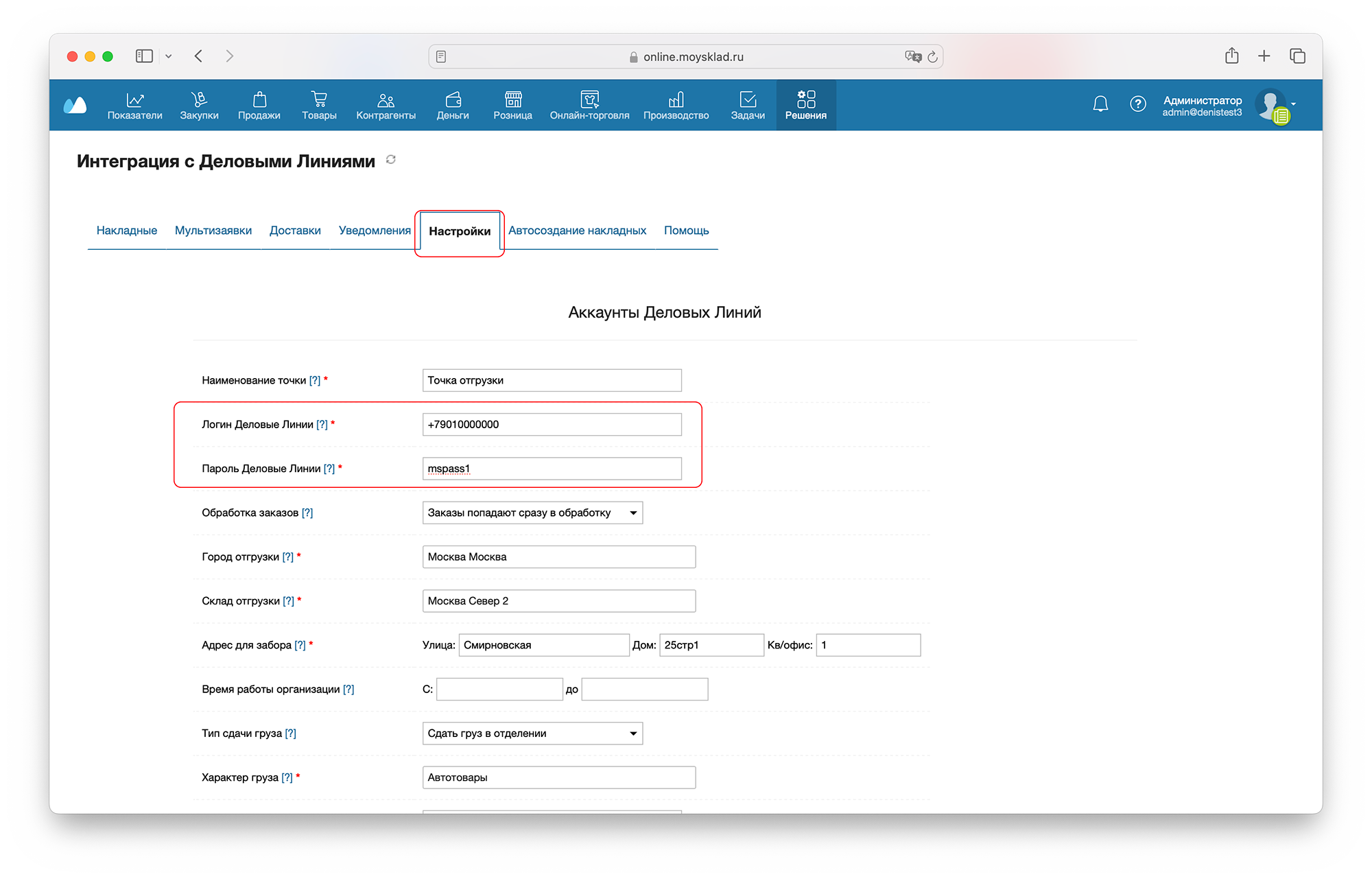 На открывшейся странице раздела "Настройки" укажите данные учетной записи dellin.ru